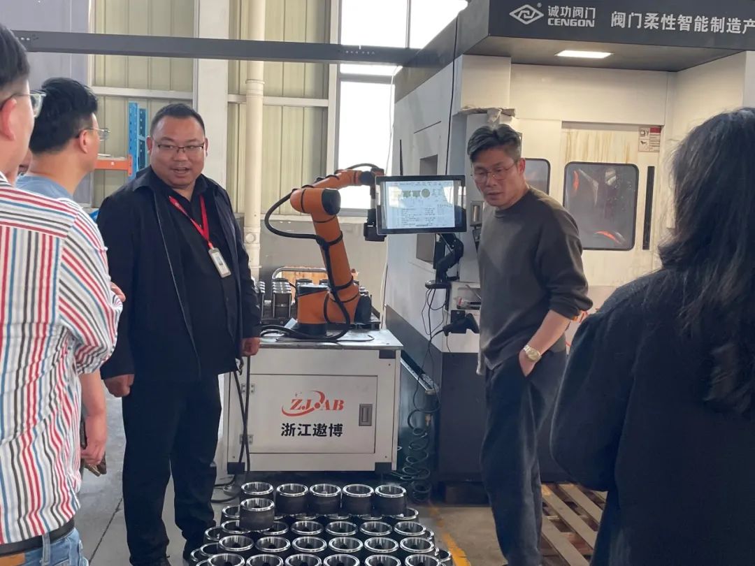 师生一行在财务总监吴亚珍和常务副总冯涛的带领下,先后参观了企业展厅、生产车间、检验中心,深入了解了诚功阀门的企业文化、行业布局、技术创新、产品生产工艺以及信息化建设等情况。在机加工车间,同学们看到上料的关节机器人,阀沃克(V-Work)智能终端展示作业指导书、知识库等信息,监控着机床的状态和参数,整个车间少人化或无人化生产。