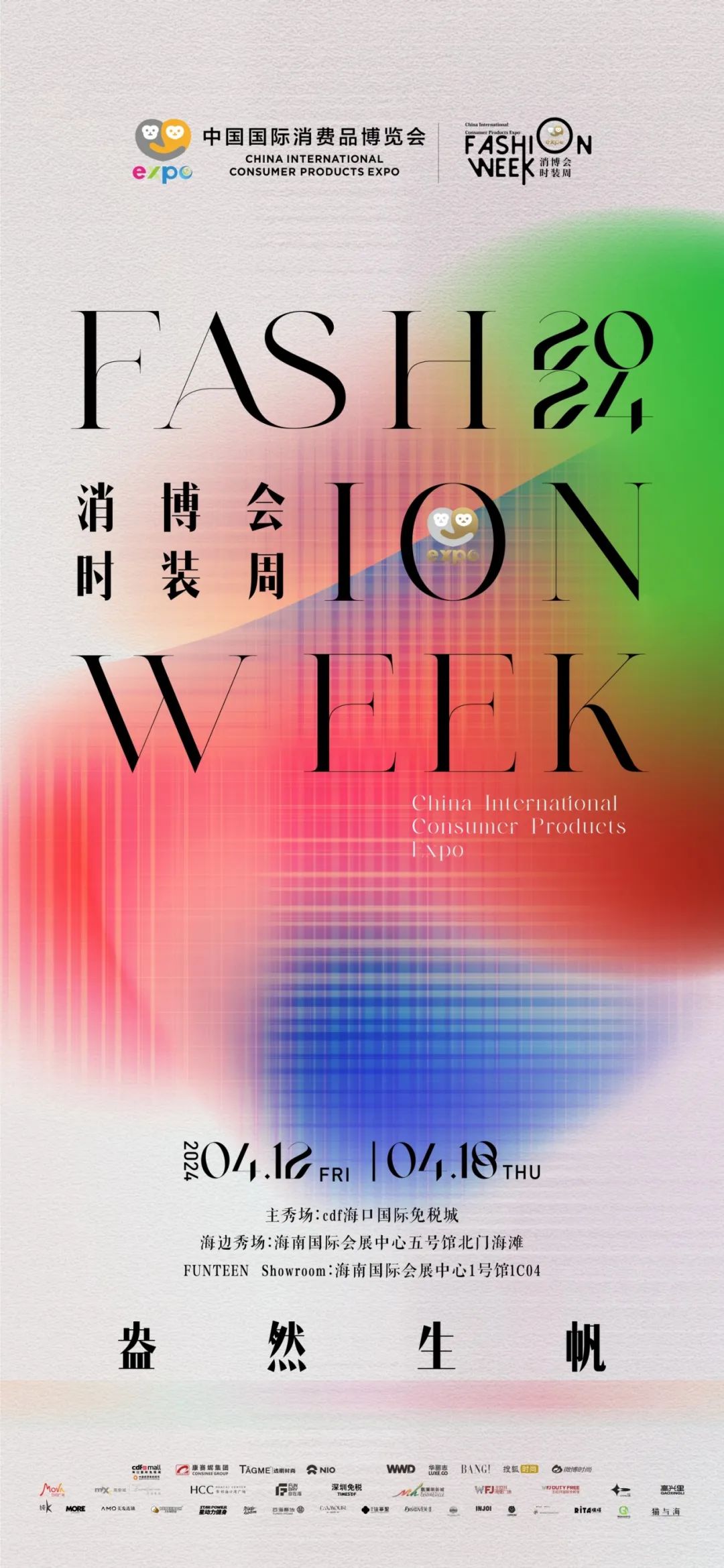 于2024年4月消博会期间举办2024中国国际消费品博览会时装周,本次消博会时装周将会携手GRACE CHEN、AWAYLEE、nunu&nono、Stolen Stores、Jenny Packham等国内外优秀设计师品牌,以时装发布秀、Showroom、论坛等形式,展示最新时尚系列单品,打造具有国际竞争力的时尚盛典。