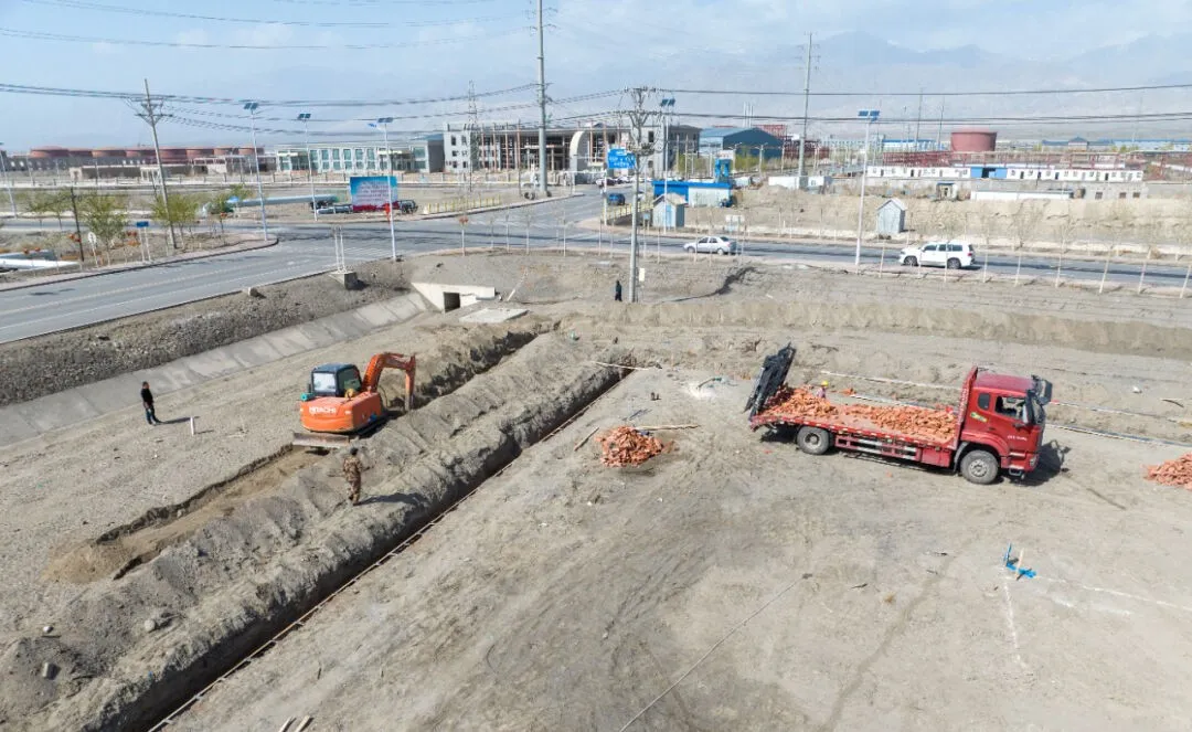在九色鹿纺织公司项目建设现场,工人们正在进行厂区基础开挖和外围施工。该项目总投资23.1亿元,分3期投建。一期投资3.2亿元,形成年产32S棉纱8000吨、20S棉纱1.2万吨的生产线。一期项目建成后,预计年销售收入4.62亿元,带动就业800余人。