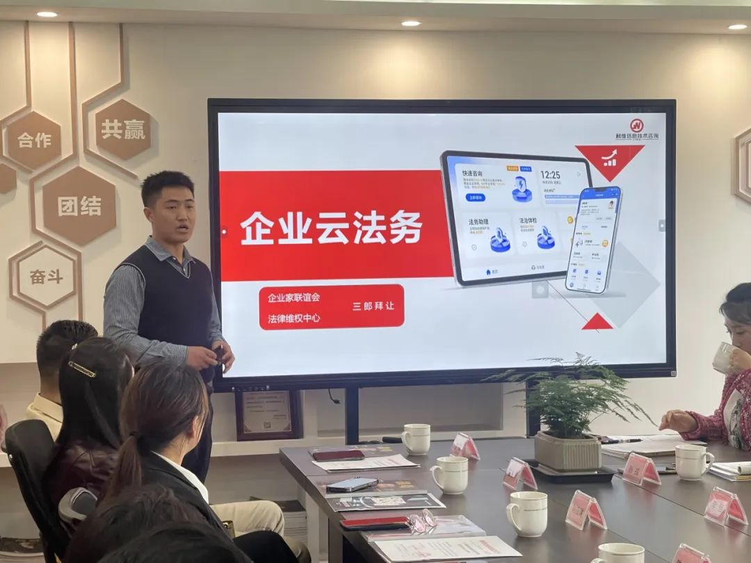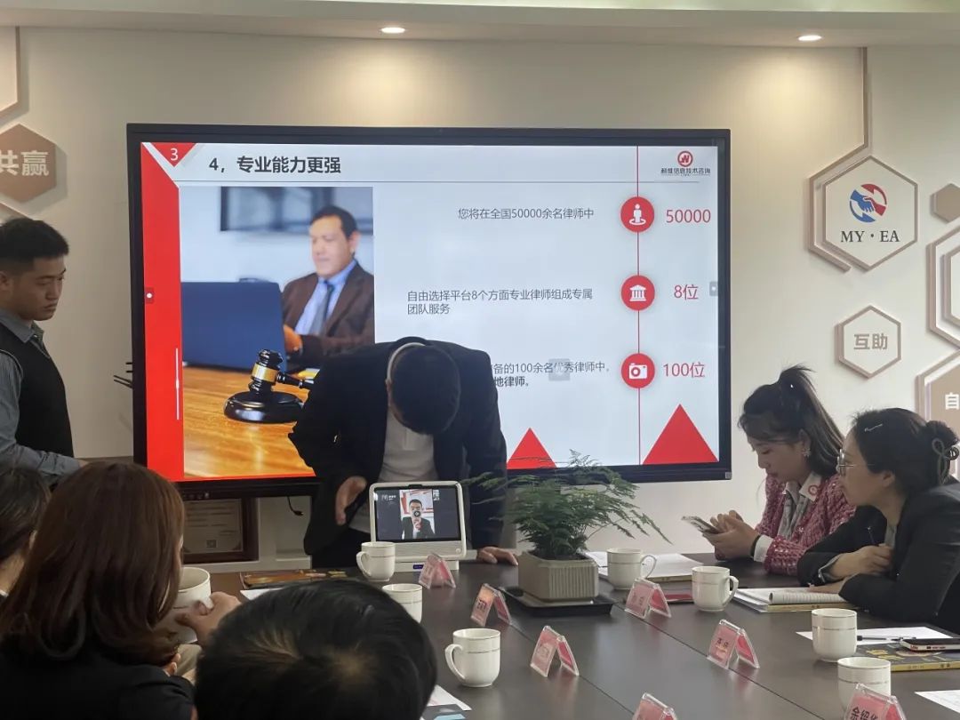 法律维权部部长三郎拜让通过PPT的方式对商会如何为企业在法律方面赋能进行了详细介绍,并对线上云法务律兜设备的使用进行操作演示,参会企业就当前遇到的法律问题进行在线咨询。