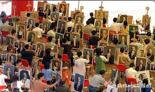大芬村能取得这样的奇迹也是经历了一个过程的,这个产业起步于1989年,刚开始时候是一个画工完成一整幅的油画临摹,画工临摹的速度很慢,会画的作品也有限。后来他们发明了一种新的协作模式,即流水线式的生产方式。