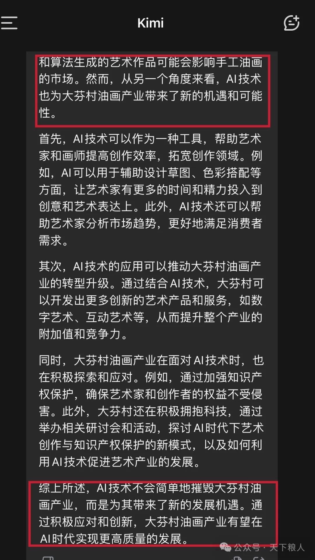 当我向Kimi提出“AI时代大芬村的油画产业会不会被摧毁”,这个问题之后,Kimi给了我一堆正确的废话,总结起来大约是:一方面AI会对传统的手工油画带来挑战,会通过算法生成艺术作品;然而从另外一个角度看,AI技术也会为大芬村油画产业带来新的机遇。最后总结说,AI不会简单地摧毁大芬村的油画产业,而是为其带来了新的发展机遇,通过积极响应河创新,大芬村油画产业有望在AI时代实现高质量的发展。