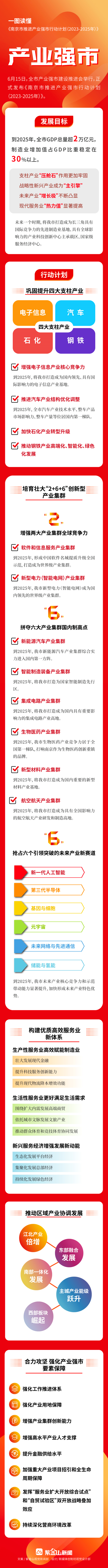 按照省委、省政府最新部署,南京大力实施产业强市战略,推进新型工业化,加强科技创新和产业创新协同,改造提升传统产业、培育壮大新兴产业、前瞻布局未来产业,推动现代服务业同先进制造业深度融合、数字经济和实体经济深度融合,实现质的有效提升和量的合理增长,加快构建现代化产业体系。