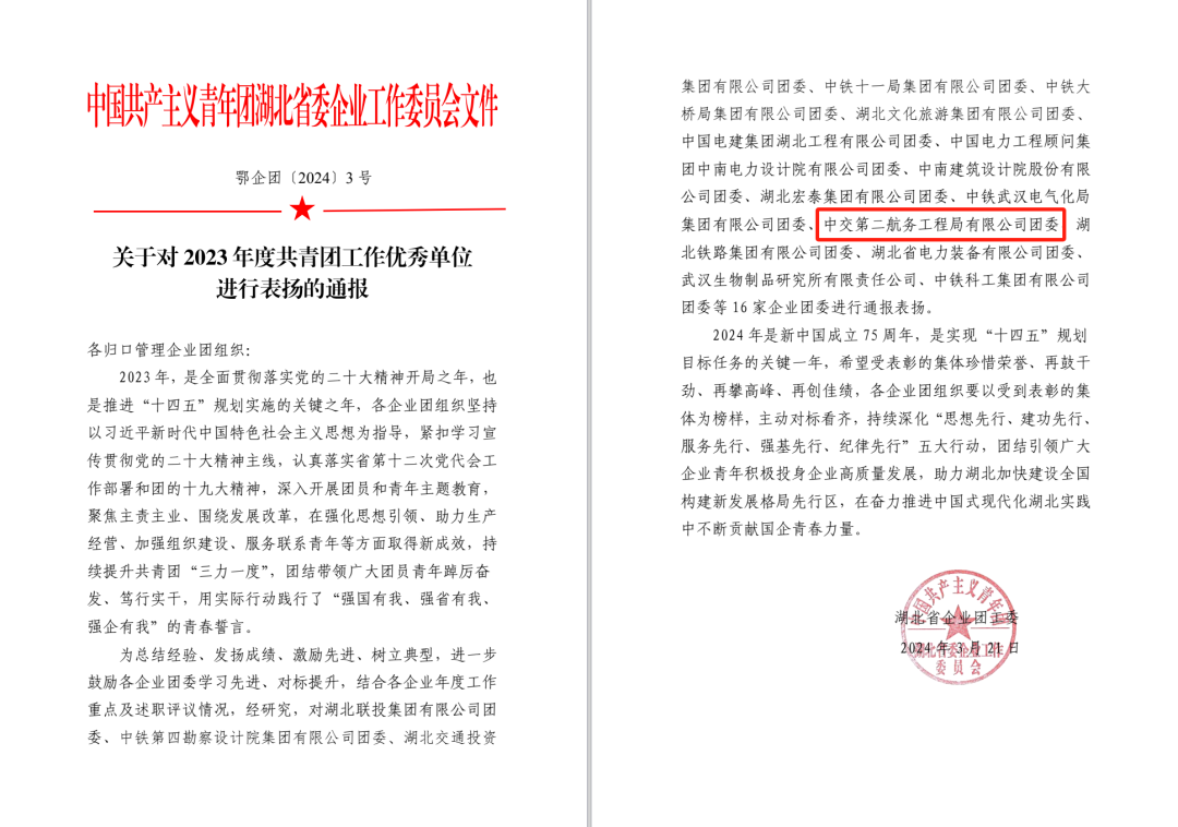 近日,湖北省企业团工委印发《关于对2023年度共青团工作优秀单位进行表扬的通报》(鄂企团 [2024]3号),中交第二航务工程局有限公司团委(以下简称公司团委)获评“2023年度共青团工作优秀单位”。