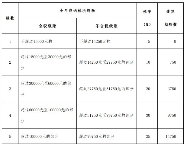 2.含税级距适用于个体工商户的生产、经营所得和由纳税人负担税款的对企事业单位的承包经营、承租经营所得;不含税级距适用于由他人(单位)代付税款的对企事业单位的承包经营、承租经营所得。