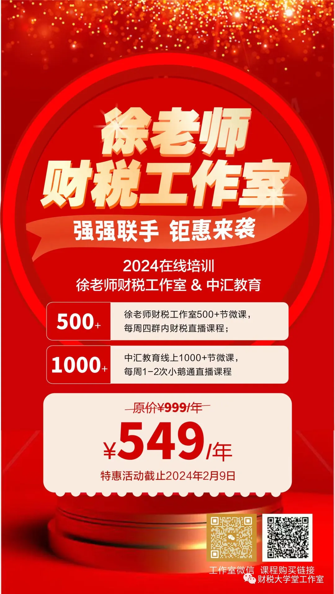 徐老师财税工作2024年会员特惠活动继续进行中!携手中汇教育平台资源,一家钱、两家课,可随时学习,实惠多多。不要999,只要549,每天一元多,即可畅听一年的免费微课,更有微信群内答疑互动等活动,欢迎新老学员报名咨询!现加入会员的,可享受买1年赠送1月的大礼包福利,数量有限,予购进行从速!!