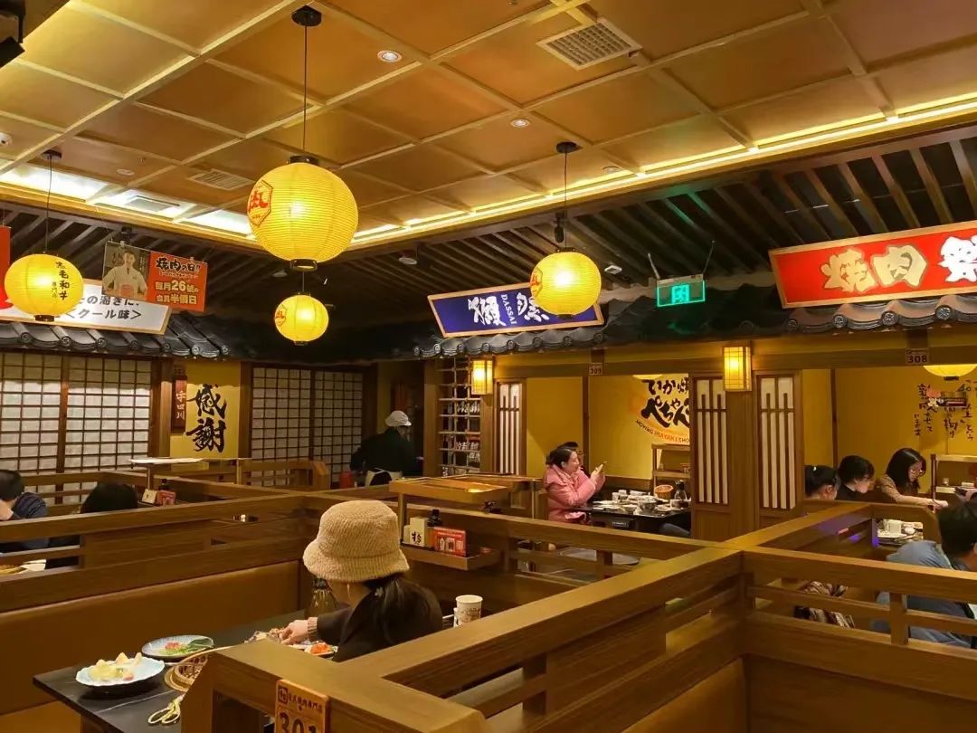 在装修风格上,牛家酒场采用纯正的和风设计,以木质暗黄色基调为主,木质门窗、日式灯笼,随处可见和风元素。
