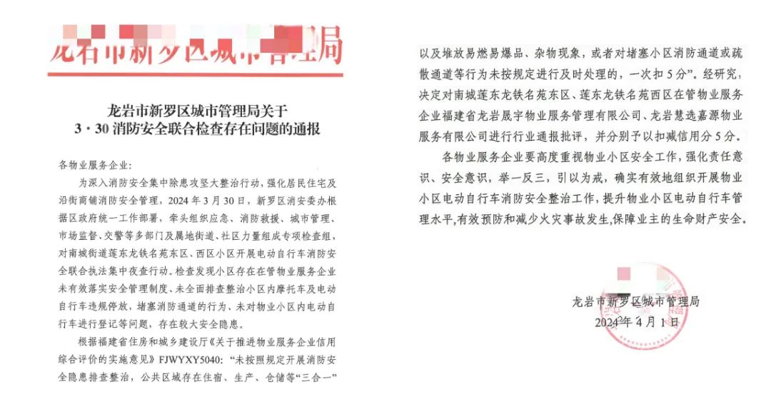 近日,新罗区城市管理局分别对南城莲东龙铁名苑东区、莲东龙铁名苑西区在管物业服务企业福建省龙岩晟宇物业服务管理有限公司、龙岩慧选嘉源物业服务有限公司进行行业通报批评,并分别予以扣减信用分5分。