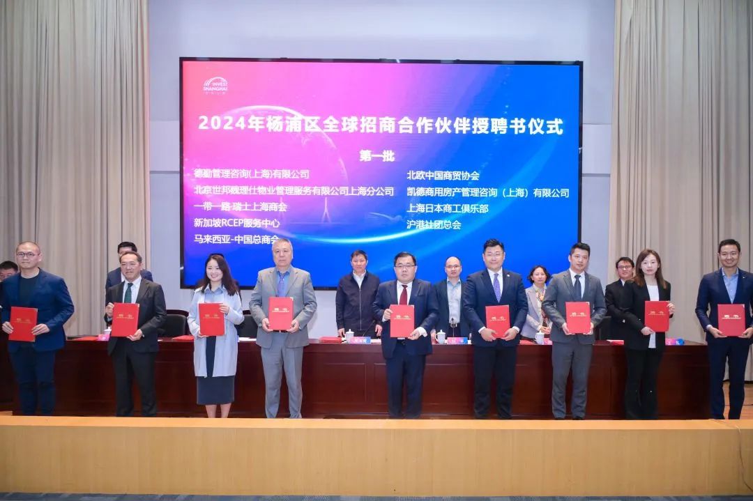 与会领导为优秀招商合作伙伴颁发荣誉奖杯,向全球招商合作伙伴授予聘书,为投资杨浦驻外服务点揭牌。戴德梁行、中信咨询、区科创促进会进行交流发言。