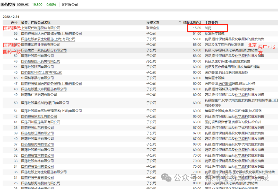 5、国药控股控股了:国药股份(北京销售)、国药一致(两广销售、国大药房),参股了国药现代(化药);国药控股自己再有全国其他地区的医药销售。