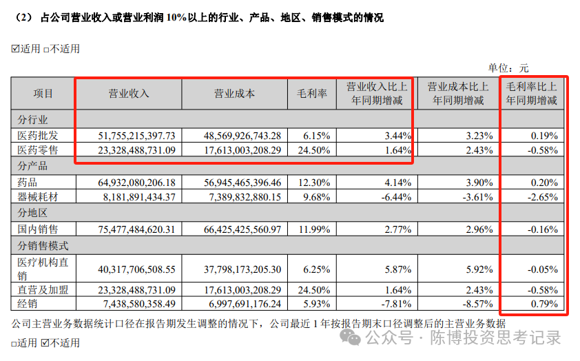 6、2023年收入增长靠分销,利润增长主要靠药房。集采降价对于流通环节也是不利,毛利率加成少了,特别是涨了60%的批发业务,毛利率仅有6%。