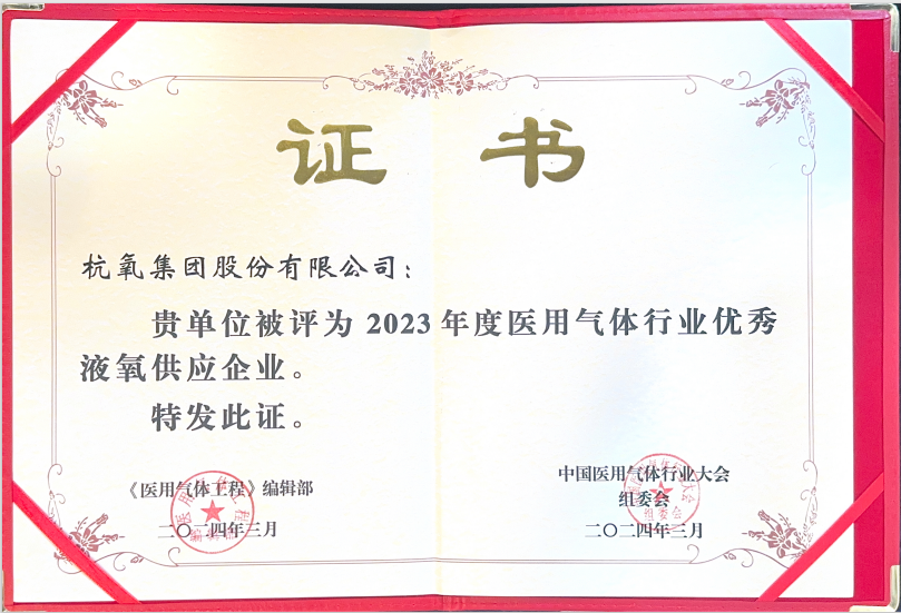 近日,在中国医用气体行业大会上,杭氧集团股份有限公司荣获“2023年度医用氧气体行业优秀液氧供应企业”的称号,这充分证明了杭氧集团在医用氧供应领域的卓越表现获得了业界普遍认可。