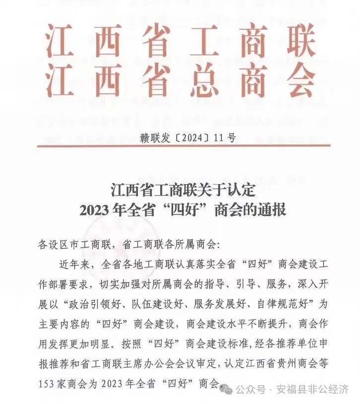近日,江西省工商联印发《江西省工商联关于认定2023年度全省“四好”商会的通报》,安福县家居建材商会成功上榜,被认定为2023年度全省“四好”商会。