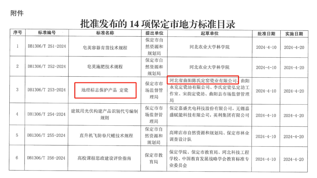 4月10日,保定市市场监督管理局发布重要公告,批准14项保定市地方标准。其中,由陈氏定窑公司主导的《地理标志保护产品—定瓷》赫然在列。此公告的发布,标志着曲阳定瓷业多年来缺乏标准化体系的困境得以破局,定瓷行业自此迈入制度化、规范化和常态化发展的新篇章。