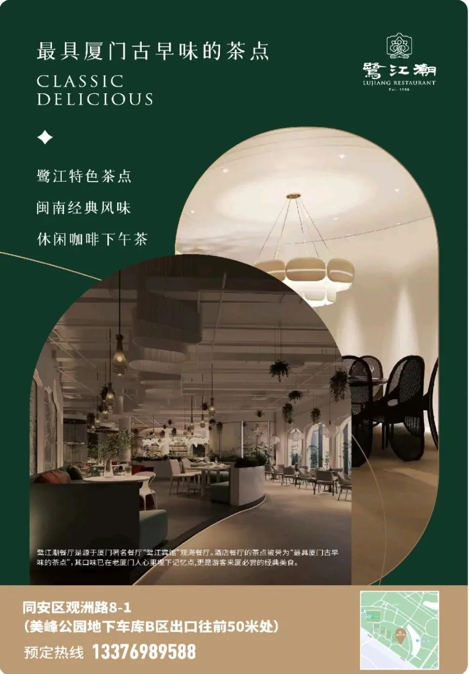 鹭江潮餐厅源于厦门鹭江宾馆,由厦门旅游集团与厦门体育产业集团强强联手,共同打造的经典传统风味茶点餐厅。餐厅环境空间从开放到半围合,再到完全私密,能够满足各种人群的用餐需求。鹭江宾馆同款品质的匠心茶点、菜品,为你开启舌尖上的美味浪漫之旅!