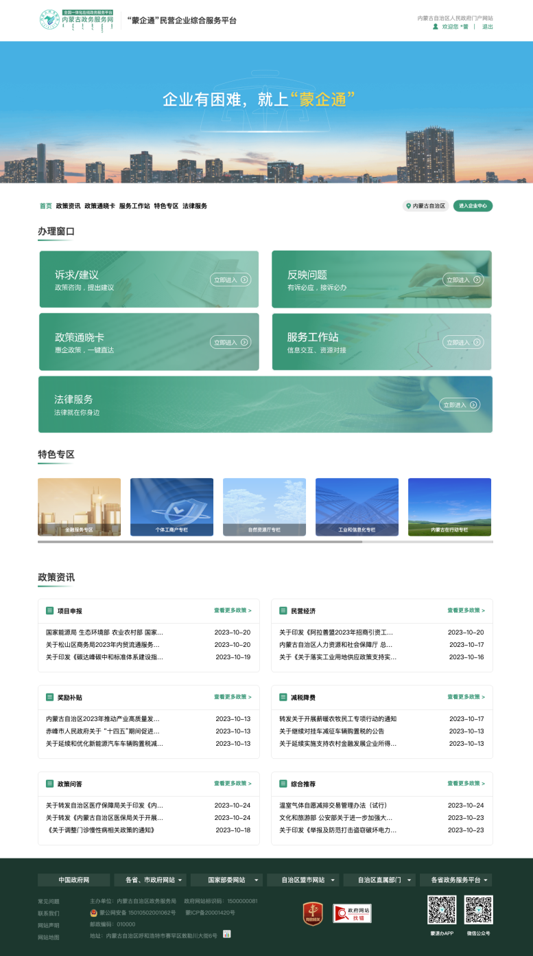 为持续优化我区营商环境,架起政企服务“连心桥”,“内蒙古政务服务网”设立“蒙企通”民营企业综合服务平台,面向全区企业提供“诉求/建议、反映问题、问卷调查、政策资讯、政策通晓卡、服务工作站、特色专区、法律服务”等优质服务。