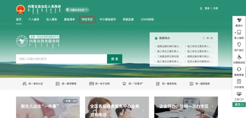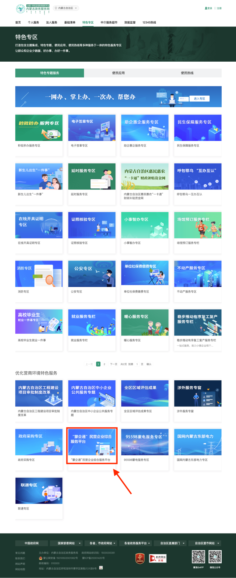 在“特色专区”内找到“蒙企通”民营企业综合服务平台。