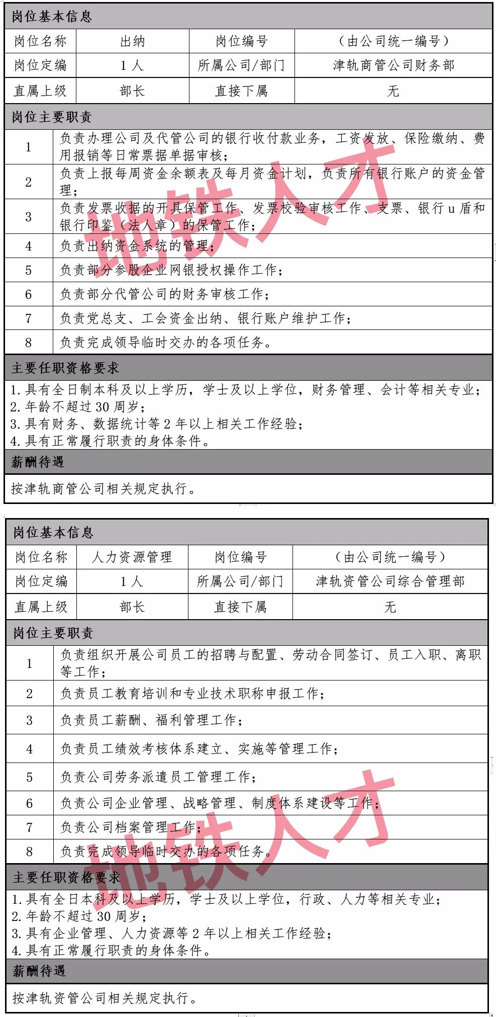 本次招聘为一般员工岗位,其中,津轨商管公司出纳岗位1名,津轨资管公司人力资源管理岗位1名。