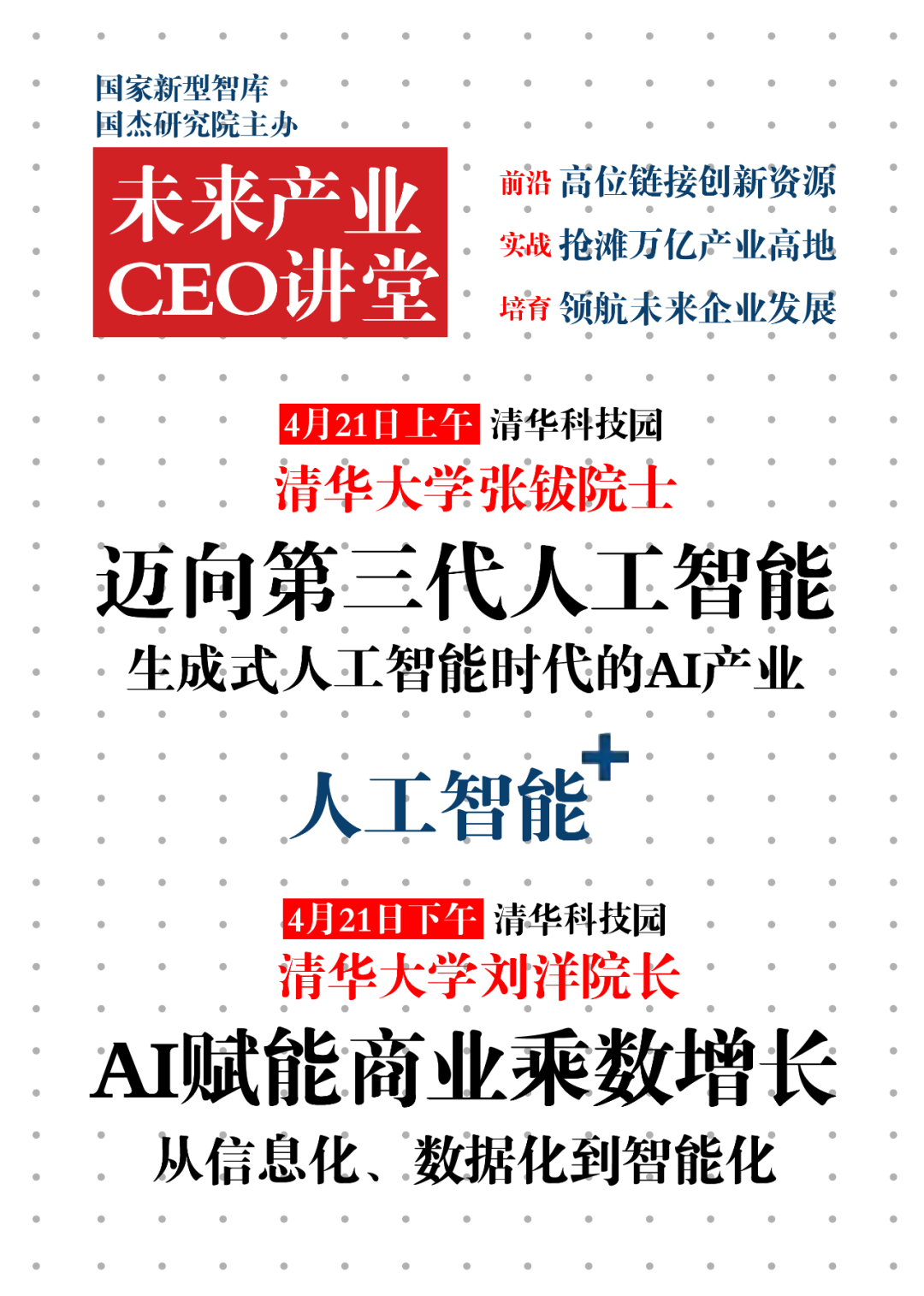 4月21日由国家新型智库-国杰研究院发起主办的《国杰未来产业CEO领航计划》特邀我国人工智能领域奠基人、著名计算机应用专家、中国科学院院士、清华大学人工智能研究院名誉院长-张钹院士领衔主讲《迈向第三代人工智能:生成式人工智能时代的AI产业》,特邀人工智能与智慧医疗青年科学家、清华大学智能产业研究院执行院长、清华大学人工智能研究院副院长、国家杰青获得者-刘洋院长闭门辅导《AI赋能商业乘数增长:从信息化、数据化到智能化》。