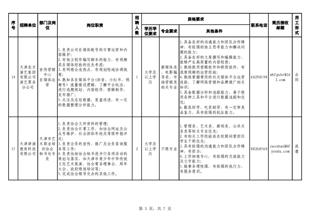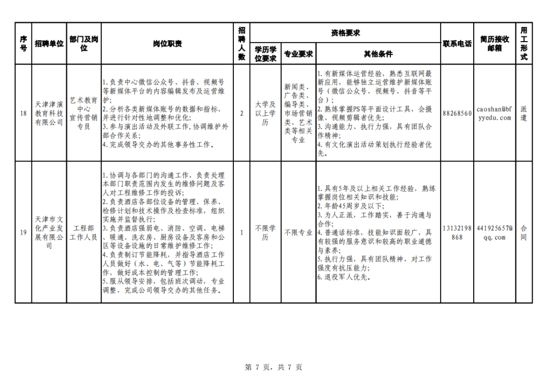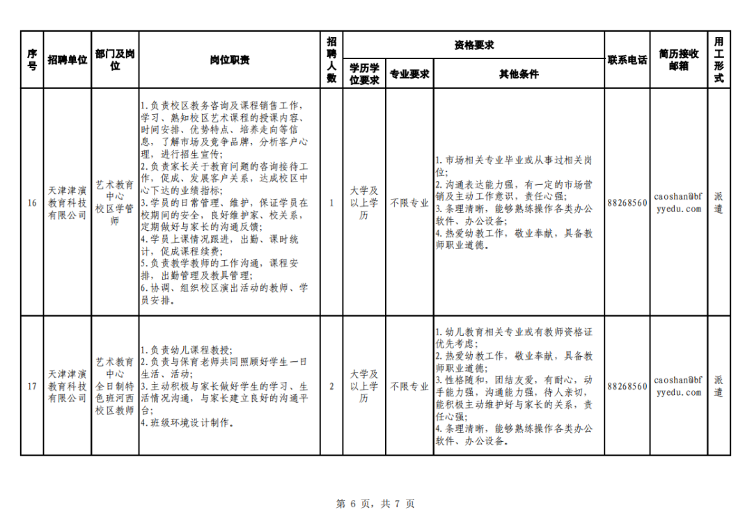 12. 天津津演教育科技公司宣传营销部宣传营销专员2名,校区学管师1名,全日制特色班河西校区教师2名,天津市艺术职业培训协会秘书处专员2名;
