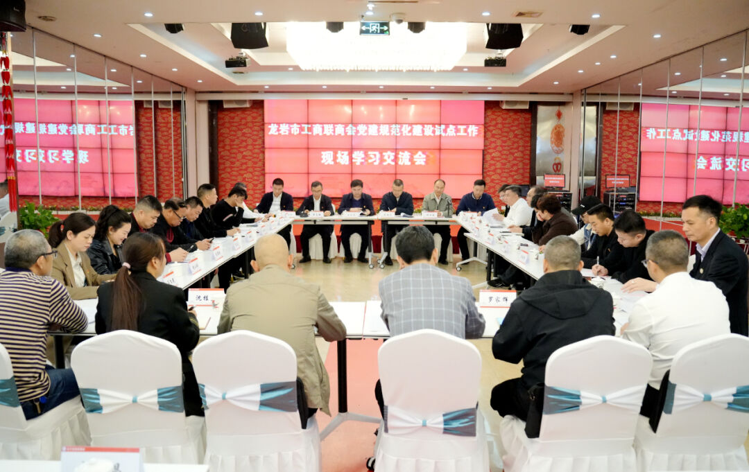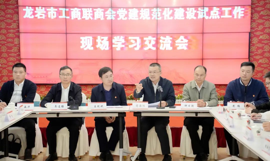 4月9日,龙岩市商会党建规范化建设试点工作现场学习交流活动在武平县举行,市委组织部部务委员、部务会成员王剑斌莅临指导,市委统战部副部长、市工商联党组书记蒋海鸿,市工商联党组成员、副主席、直属商会综合党委书记廖连强,市委统战部机关党委、各县(市、区)工商联有关领导和试点商会党支部负责人参加。