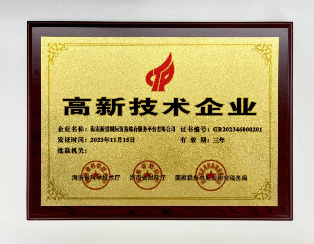 2023年,海南新型国际贸易综合服务平台(简称“海贸服务”)依托专业的研发队伍、卓越的持续创新能力以及完备的体系文件,结合科学的企业管理,成功完成了企业申报、地方初审、专家审查、机关公示等一系列程序,于同年11月荣获“高新技术企业”认证。