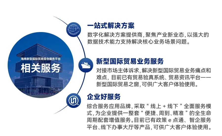 海南新型国际贸易综合服务平台有限公司(简称“海贸服务”)围绕产业园区招商、运营、服务、管理等业务场景及入驻企业的多样化需求,搭建线上数字化产业园区服务平台,面向自贸港各类产业园区提供招商推介、空间运营、管理信息化、客户数据分析等服务,针对企业提供政策咨询、人才服务、奖励兑现、商事代理等一站式服务。