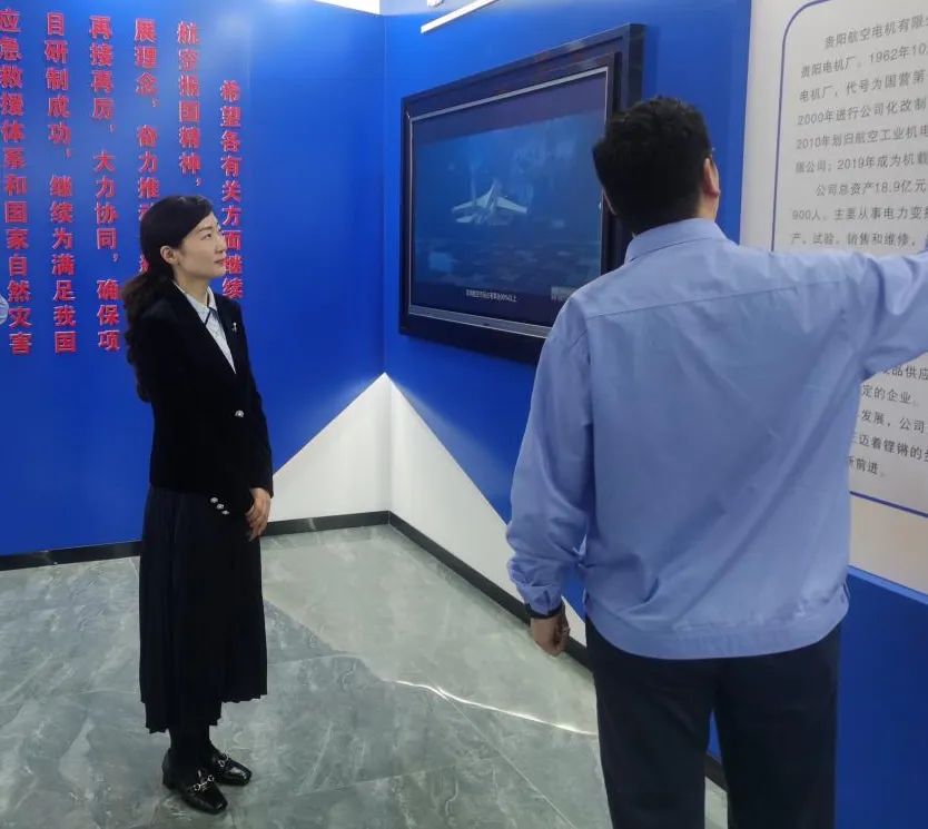 在贵阳航空电机有限公司,徐倩参观了企业展厅,详细了解企业历史沿革、产品类型、营业收入等情况。徐倩强调,贵阳航空电机有限公司作为中航工业板块公司,人才科研力量实力强大,科技和创业服务中心要立足本职本业,宣传好“科学家工作站”建设、“科技副职、科技专员”服务企业计划政策,帮扶企业开展建设工作,助力企业在技术创新与发展道路上取得更大的突破。