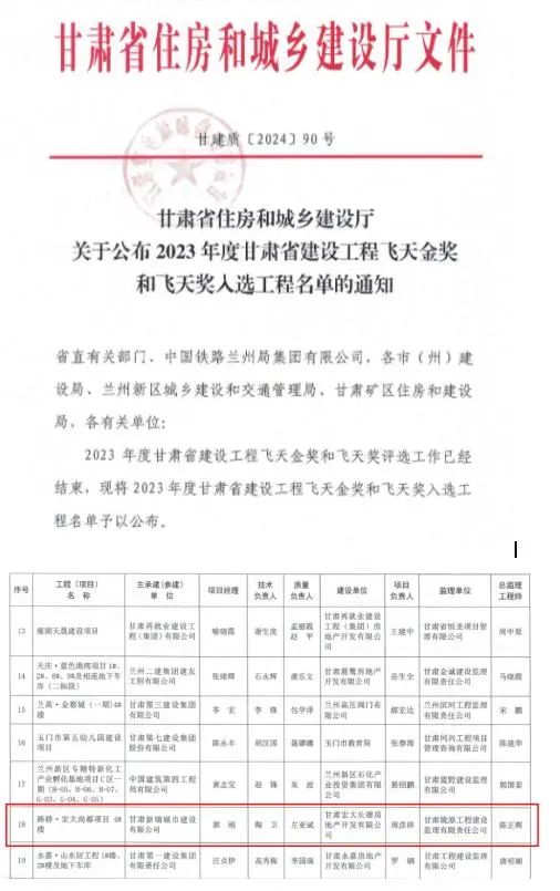 甘肃省建设工程“飞天奖”是省政府批准的全省建设工程质量最高奖项,每两年评选一次,评选标准高,质量要求严。该奖项的获得充分展现了新瑞公司专业高效的管理能力,进一步提升了公司在专业领域的核心竞争力和品牌影响力。
