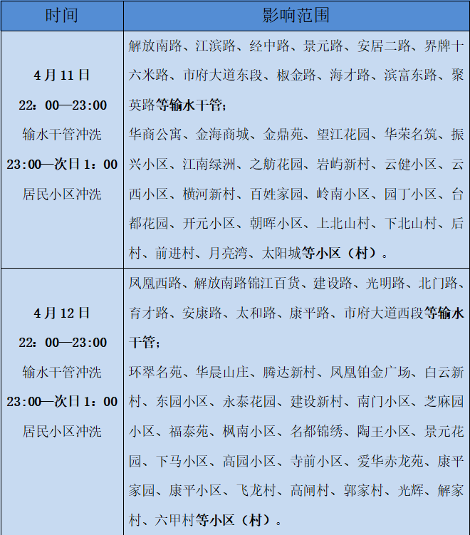 管网冲洗安排表(点击查看大图)冲洗期间,冲洗区域可能出现短时水压降低或水浑现象,给您带来不便敬请谅解!如遇供水问题请拨打热线:88223023。往期推荐“台州发生惨剧!致1人死亡,冯某被刑事拘留”““神操作”一个接一个!台州这个小区刚交付,业主心态崩了...”“699万+651万!台州又多两位超级大富翁”“罪犯史泰龙,被执行死刑!”商务、爆料加微信:szwz_0577小编起早贪黑只求您的鼓励