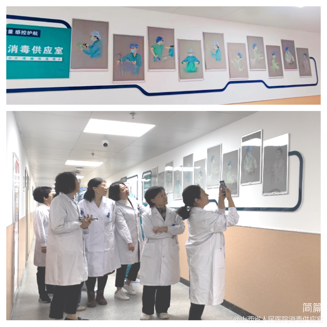 护士长马艳通过人物素描图介绍了消毒供应室的十项操作流程。流程图由科室人员靳璟手绘创作,以消毒供应室的工作人员为原型,通过绘画形式展示了各环节的操作特征。参观老师们纷纷驻足拍照留念。