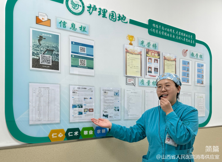 科室总带教任心心对辅助区走廊两侧的展板和照片墙分别进行了介绍,展示了消毒供应室的发展历程、质控管理、科室文化和培训考核等相关内容。