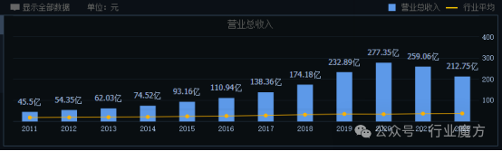 2011-2022年,由于恒瑞医药药品销量的持续增长,恒瑞医药公司主营业收入同步保持持续增长(2020-2022年,受集采影响,主营业收入有所回落),从2011年的45.5亿元增长到2022年的212.75亿元,增加了367%,增长幅度较大。