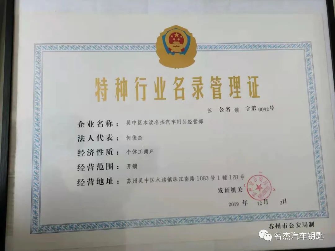 苏州名杰汽车钥匙是经工商注册,公安备案的正规开锁公司,本公司秉承客户至上,诚信至上的经营理念,为全市民提供24小时上门开锁、换锁服务,配各种汽车芯片钥匙,智能钥匙。