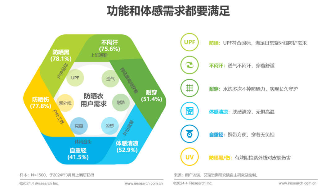 用户对于防晒衣的需求不再是单点的,需要六位一体的全面守护