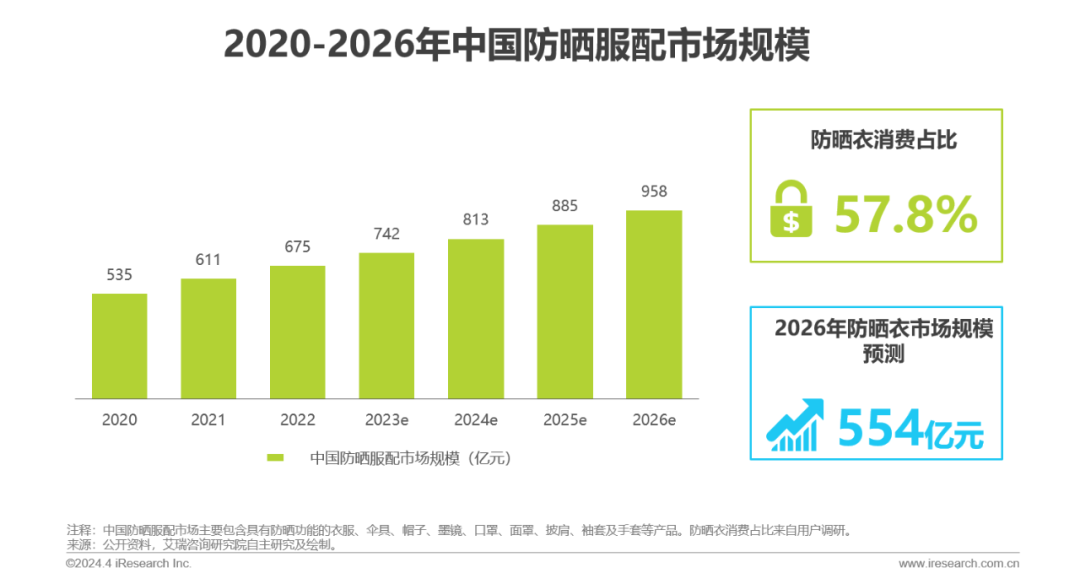 防晒衣是防晒服配市场的重要类型,预计26年防晒衣市场规模可达554亿