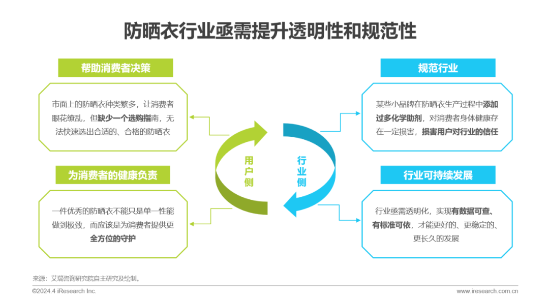 防晒衣供需双方的角色已经发生了转变,用户需求对市场发展驱动的重要性愈发明显,因而供给侧更有责任构建一个更加规范、有序的消费环境,这不仅能够帮助消费者决策、为他们的健康负责,对防晒衣行业的稳定性和可持续性发展也同样有益。