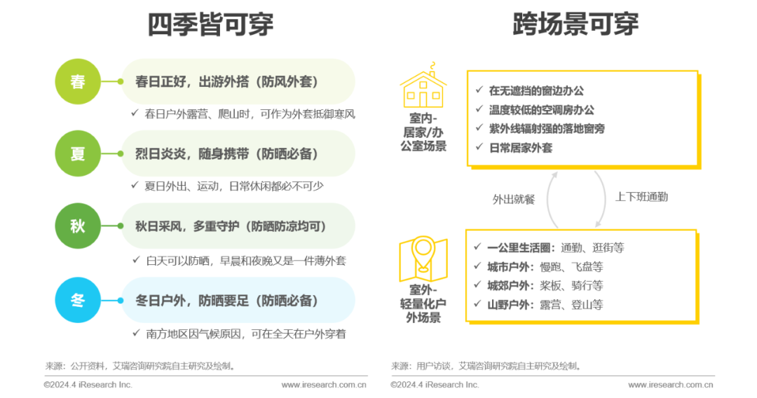 防晒衣的多功能性使其能够满足跨越不同季节和场景的需求。在炎炎夏日,防晒衣能够提供有效的紫外线防护,使人在户外活动时保持凉爽舒适;而处于亚热带/热带季风气候的南方,防晒衣在冬季同样能够为皮肤提供紫外线防护。在场景方面,防晒衣也因其功能性多、实用性强、时尚性高而与消费者的生活有更强链接,甚至在跨越不同场景时,也能成为消费者理想的选择。