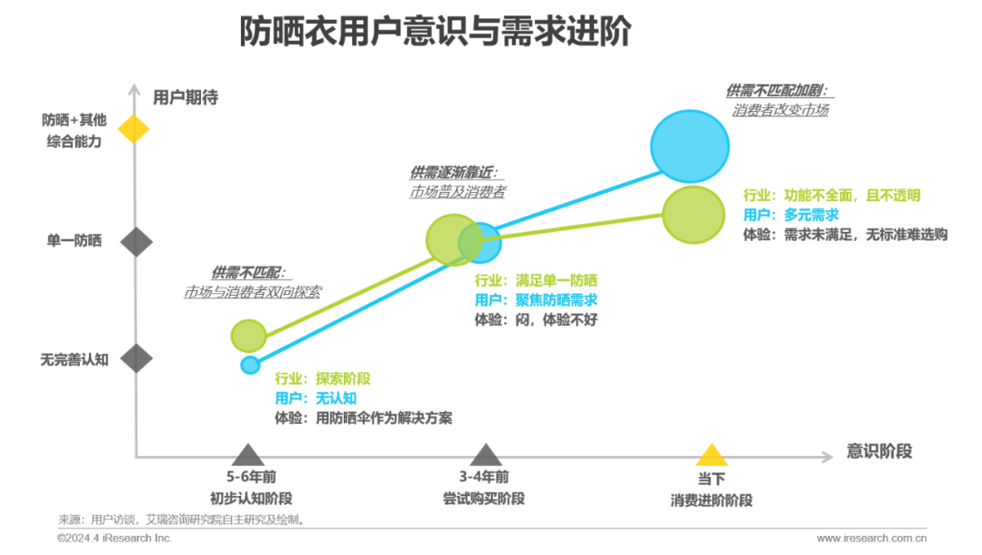 消费者防晒衣意识主要可以分为3个阶段:5-6年前,初步认知时,大众对于防晒衣的意识相对薄弱;到3-4年前,行业逐渐对消费者进行普及,消费者防晒衣意识逐渐增强,开始尝试购买一些防晒衣,但那时防晒衣行业更强调产品的防晒力,导致消费者整体穿着体验不佳;当前,用户防晒衣意识有了更进一步的提升,消费者需求的更加多元化,市场也进入被消费者反向改变阶段。