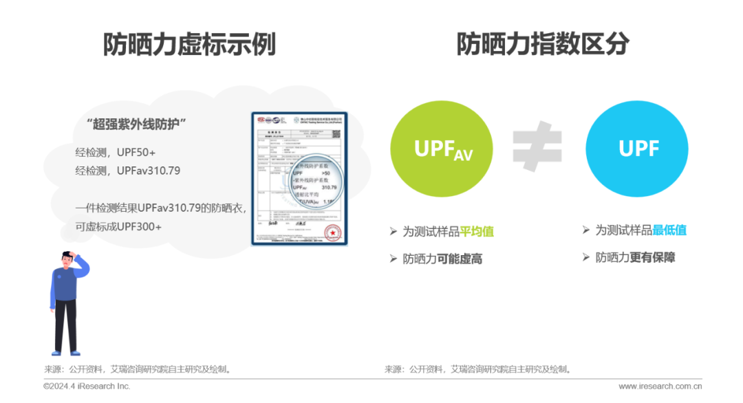 据调研,UPF是国家对纺织品制定的防晒标准,用于评估纺织品对紫外线的防护能力,而部分品牌用UPFAV误导消费者,导致消费者误以为产品的防晒能力更好。事实上,UPF和UPFAV虽都是防紫外线测试中的指数,但二者有本质差异,前者表示测试样品的最低值,而后者代表的是测试样品的平均值,换句话说用UPFAV来衡量一件产品的防晒能力可能不太准确,有虚高的风险。
