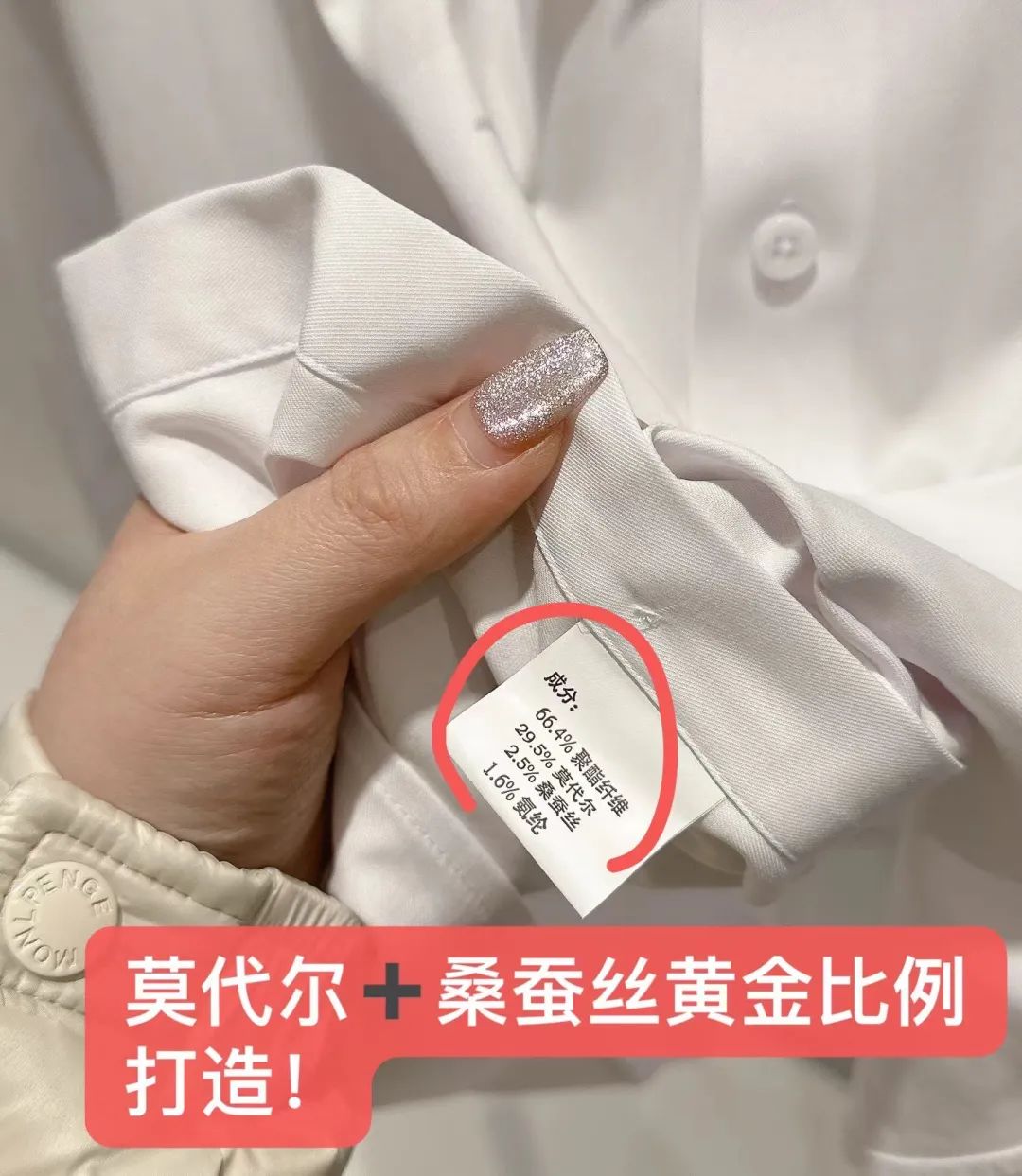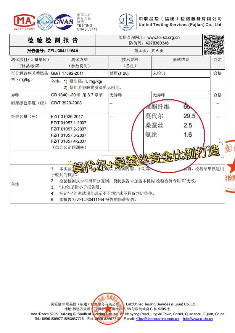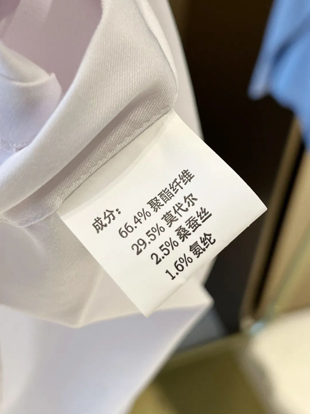 面料:66.4%聚酯纤维 +29.5%莫代尔+2.5%桑蚕丝+ 1.6%氨纶。