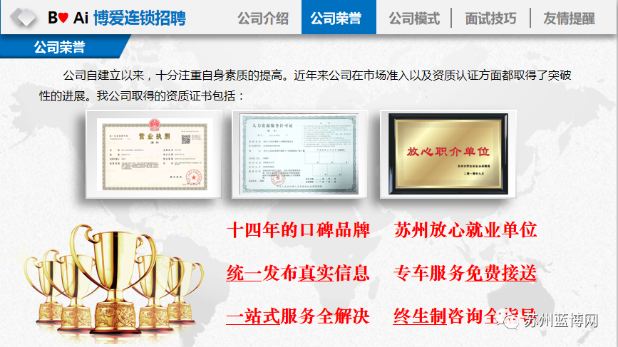 博爱人力资源  成立于二〇〇六年,十多年以来,始终口碑服务,深耕苏州园区,向周边及长三角地区百余家企业输送人力达数十万人次,深得客户好评。公司在多个地区设有分、子公司,获得《人力资源服务》《劳务派遣许可》《民办学校办学许可》《创业培训定点单位》等多项行政许可和定点合作资质。业务涵盖人力资源服务、技能培训服务、创业培训服务、管理咨询培训和政务外包服务等众多个领域。