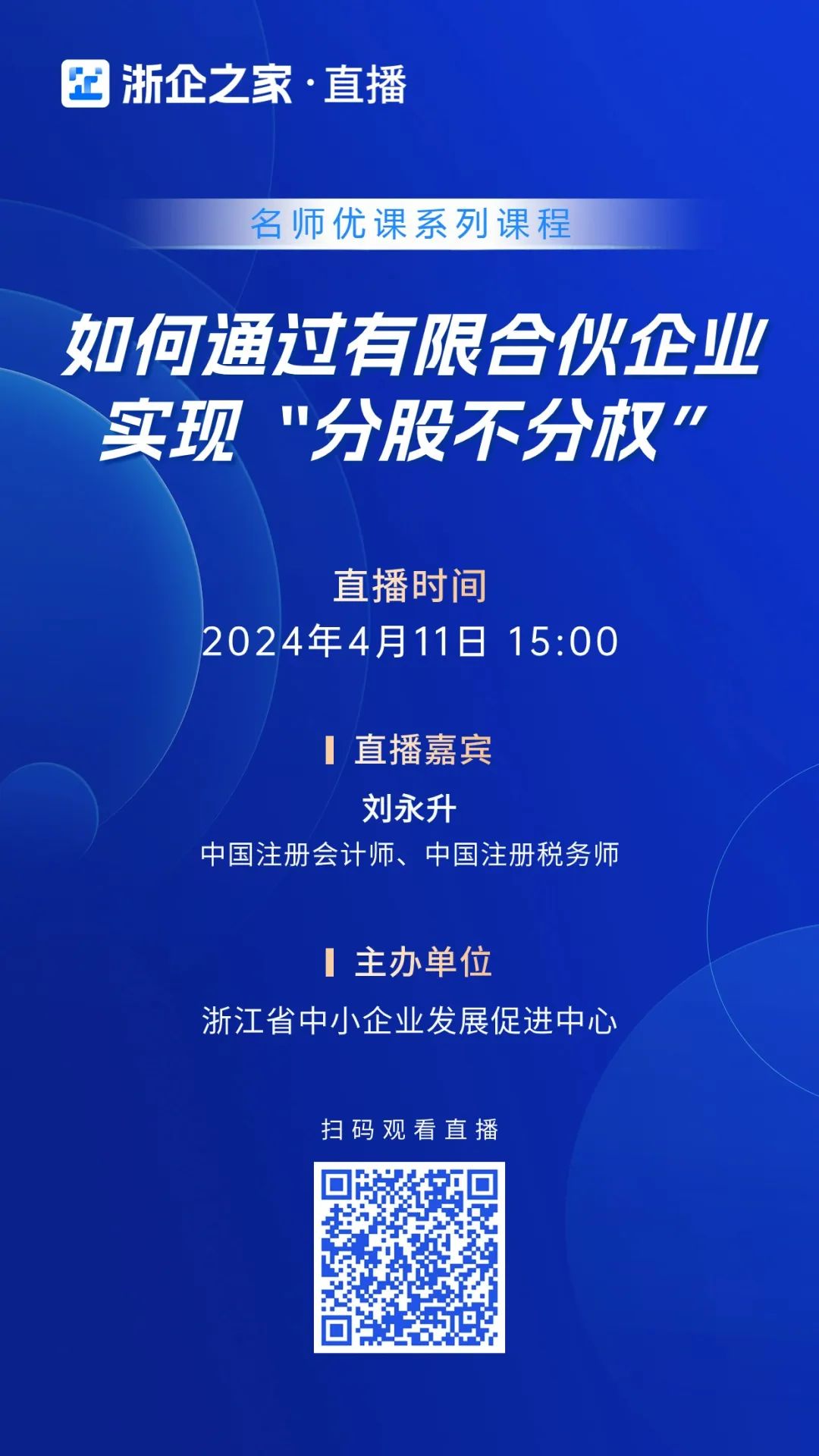 浙企之家直播间特推出名师优课直播季,海量精品课程均可观看!本期课程由中国注册会计师、税务师刘永升带来课程:如何通过有限合伙企业实现“分股不分权”。