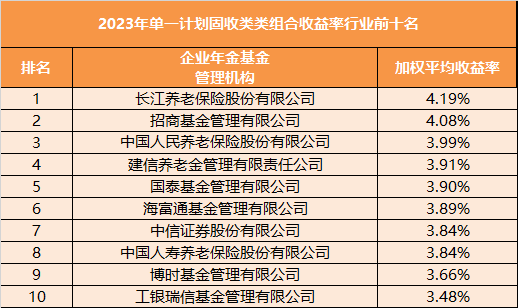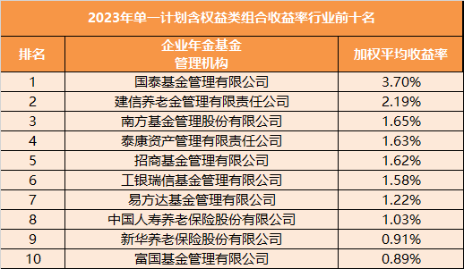 由于部分投管人没有集合计划,且目前80%以上的企业年金资金集中在单一计划,小泰也把单一计划收益前十的机构数据进行了统计。2023年单一含权组合收益排名前三的是国泰基金、建信养老、南方基金。单一固收组合收益排名前三的是长江养老、招商基金,人民养老。