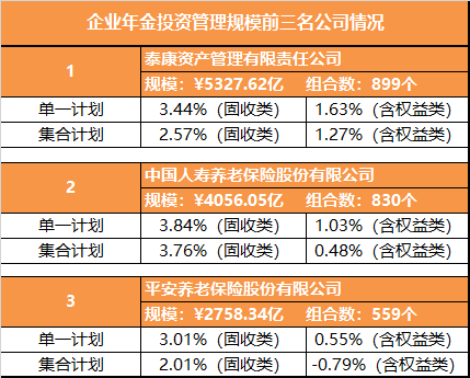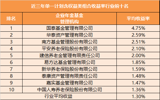 根据人社部数据,市场占比较大的为含权计划(有投资股票的年金计划,规模占比超过85%),因此小泰也将近三年收益前十的机构进行统计。