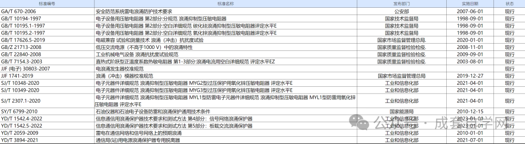 下图是浪涌的相关国家标准号,用于对浪涌的设计、生产、制造、试验等;