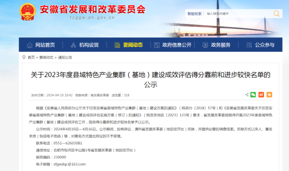 近日,安徽省发展改革委公布了2023年度县域特色产业集群(基地)建设成效评估工作中得分靠前和进步较快的名单,