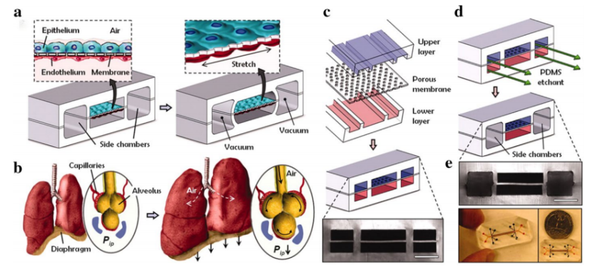 含有上下两个通道,两个通道由一种薄的柔性的多孔膜隔开。将不同的细胞培养在膜两侧:上通道为人肺泡上皮细胞,下通道为人肺微血管内皮细胞。肺芯片的微装置中诱导培养了内皮和上皮细胞,可以表现出复杂的器官层次的生理功能。