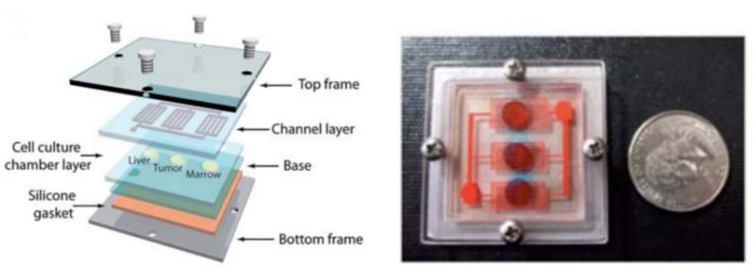 器官芯片(Organ-On-Chip, OOC) 广义上被定义为用于体外模拟人体器官的功能单元的微型细胞培养装置。是以微流控芯片为核心,由透明塑料、玻璃或柔性聚合物(如聚二甲基硅氧烷,PDMS)等材料组成,具有多个模拟人体组织和器官环境的细胞培养分区,各分区之间通过仿生循环系统进行连接。狭义上,器官芯片特指微流控芯片及其配套使用的灌流装置。