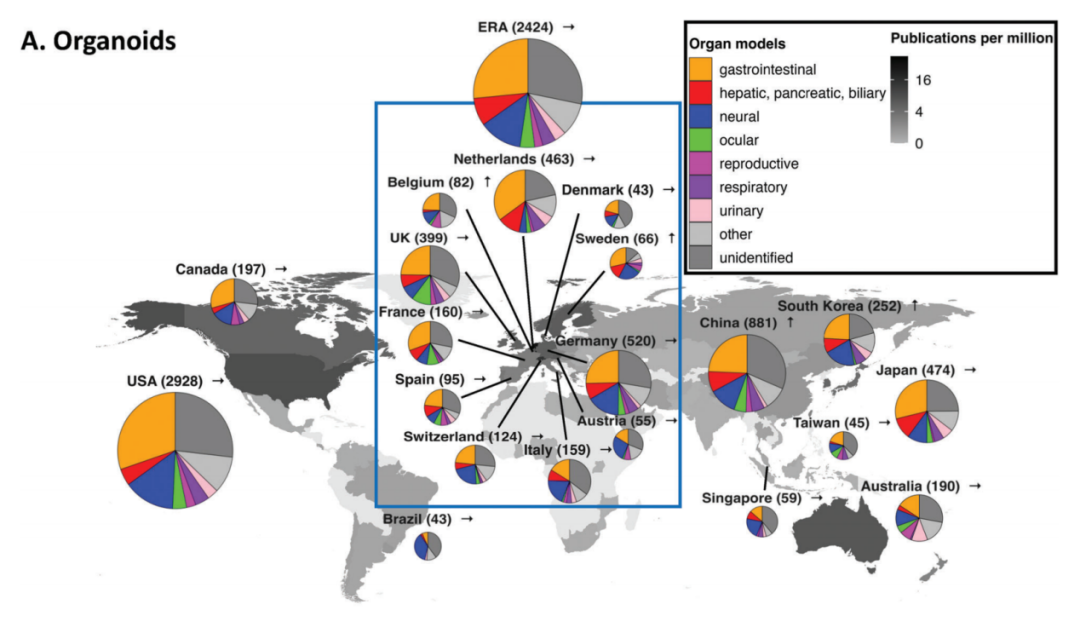 中国的类器官技术起步相对较晚,但是发展迅速。2016-2021年成立的类器官企业已超过14家,陆续落地于北京、广州、上海、苏州、杭州等城市。科技部在2021年1月将“基于类器官的恶性肿瘤疾病模型”列为“十四五”国家重点研发计划中首批启动的重点专项任务,加速了相关产业化进程。中国科研积累的提升也在推动类器官技术的发展,中国在该领域的发表文献数量在全球排名第三位,且增长速度是全球平均水平的两倍。